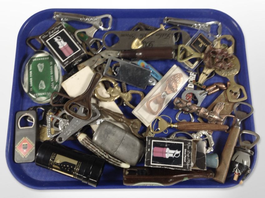 A collection of vintage and modern bottle openers, Guinness items, etc.