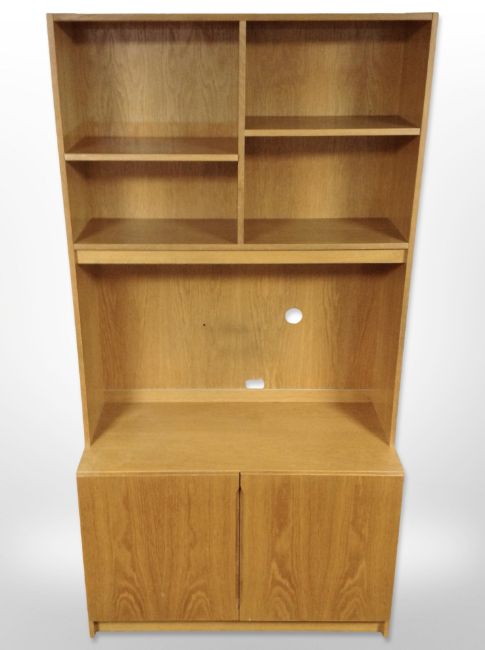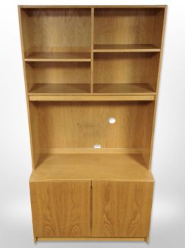 A late 20th century Danish oak veneered open bookcase with cupboards beneath, 100 cm x 48 cm x 195 cm
