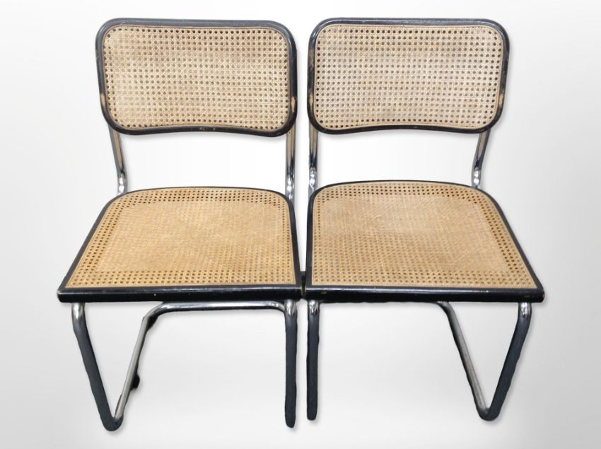 A pair of chrome-framed ebonised cantilever chairs with bergere seats.