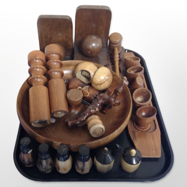 A group of treen including sifters, corkscrews, fruit bowl, pair of book ends, salt and pepper grinders, etc.