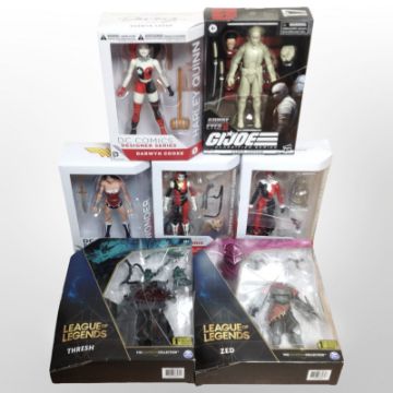 Four DC Collectibles Superhero figurines, Hasbro GI Joe figurine, and two Spin Master League of Legends figurines, all boxed.