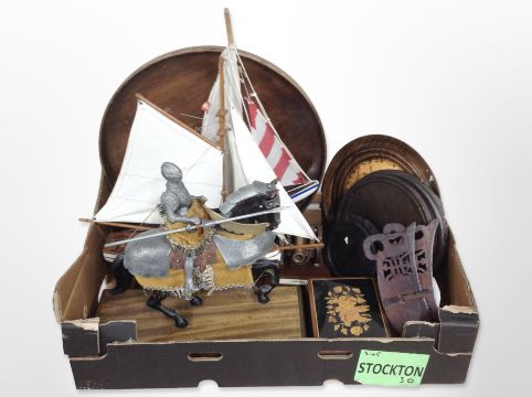 Two model yachts, together with various wooden items, brass model of a cannon, figure of a knight on horseback. (1 box)
