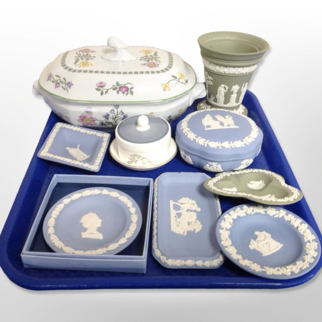 A group of Wedgwood green and blue Jasperware, Royal Worcester circular porcelain pin dish, Wedgwood circular trinket box, and a Spode Summer Palace tureen.