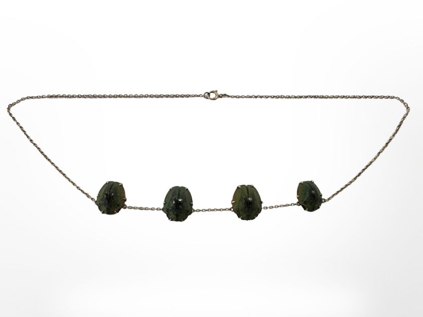 An antique gold mounted scarab beetle necklace, length 40cm.