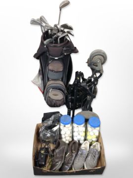Golf equipment including electric trolley, bag containing Diawa and Dunlop irons, box of golf shoes, balls etc