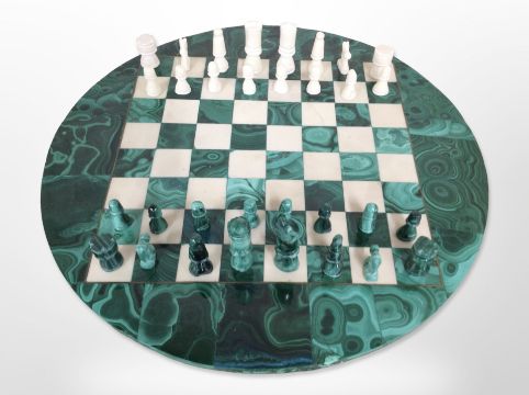 A polished malachite circular chessboard and pieces, diameter 40cm.
