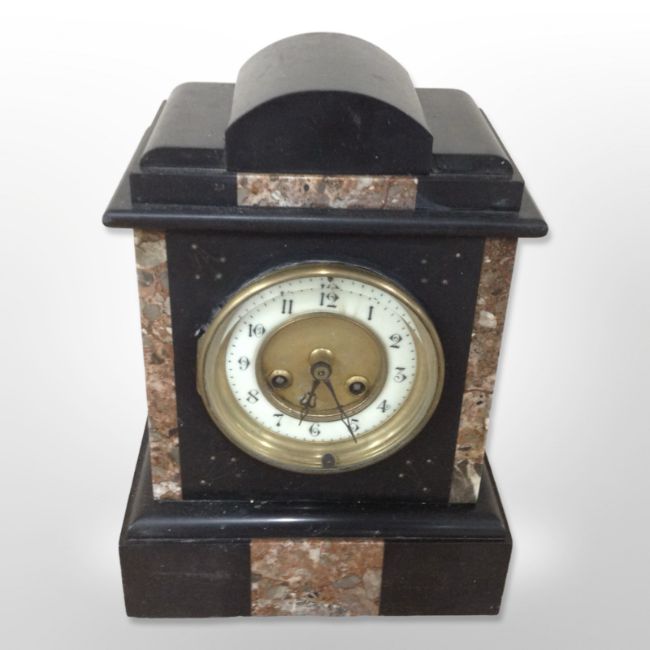 A Victorian black slate and rouge marble mantle clock, height 27cm, striking on a bell with pendulum.