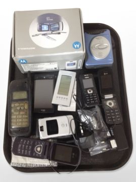 A group of vintage and later mobile phones, portable stereo radio, etc.