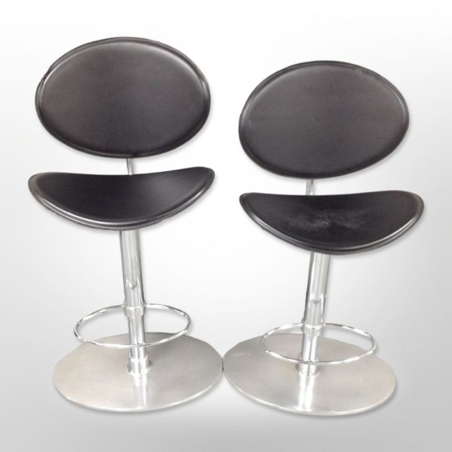A pair of contemporary chrome and black stitched vinyl adjustable bar stools.