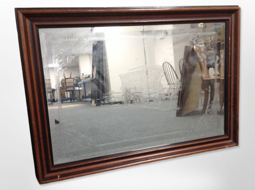 An etched over mantel mirror depicting a gypsy caravan, 104 cm x 74 cm
