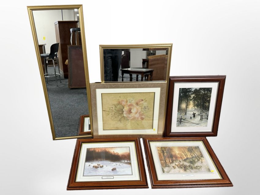 A group of gilt-framed mirrors, largest 122cm x 40cm, two contemporary prints after Joseph Farquharson, and two further prints.