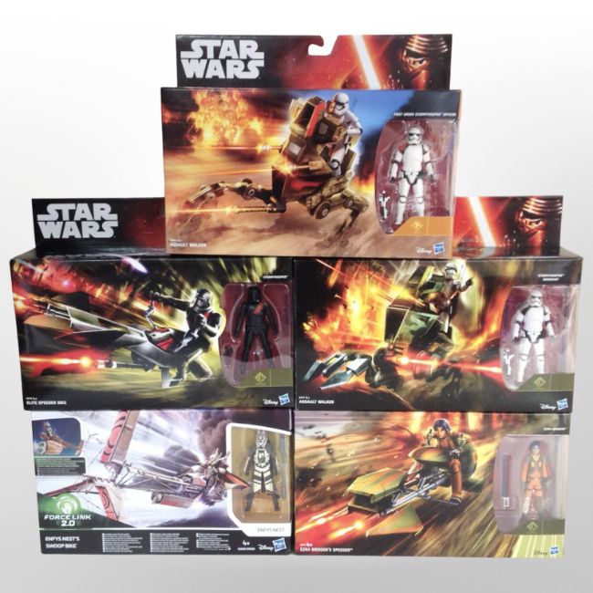 Five Hasbro Disney Star Wars figurines including Assault Walker, Elite Speeder Bike, etc., boxed.