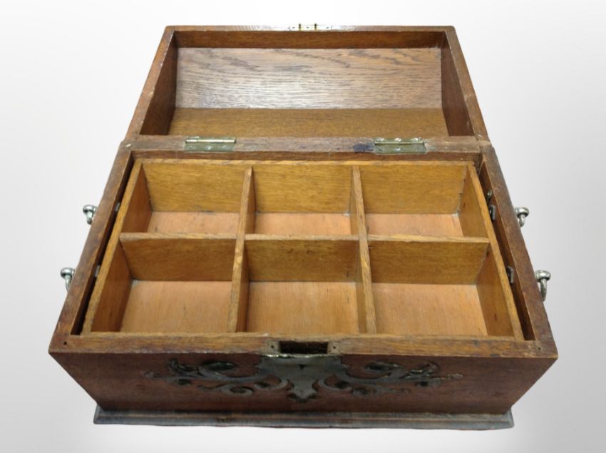 An oak and metal-bound dome-topped table casket, width 36cm.