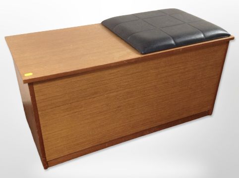 A 20th century teak blanket box with black vinyl cushion top, 91 cm x 43 cm x 48 cm