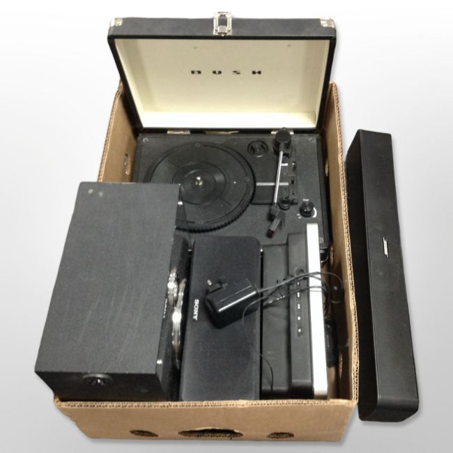 A Bose Solo 5 TV sound system, together with a Bush portable record player, Gear 4 iPod speaker, Sony speaker, etc. (1 box)