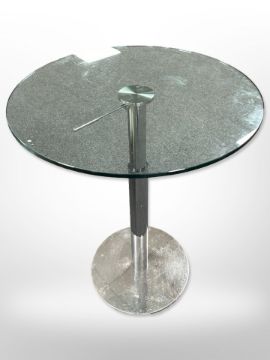 A contemporary circular glass pedestal bar table on chrome metal adjustable support, diameter 81 cm