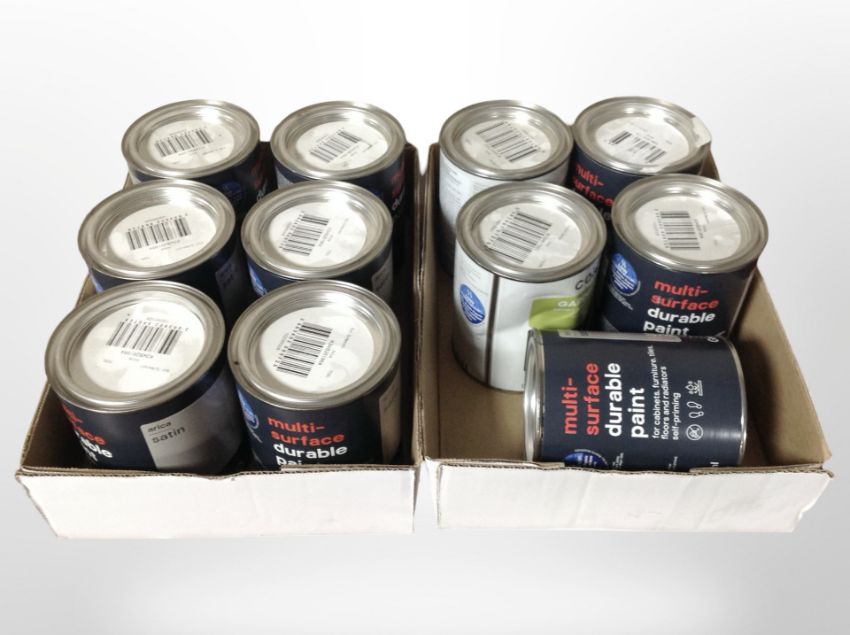 11 various tins of paint, all 750ml.