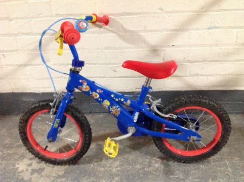A child's bike, together with a Flymo garden vacuum and several tools.