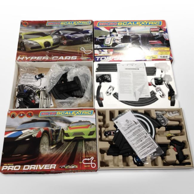 Three Micro Scalextric racing sets, in boxes.