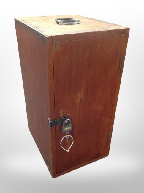 A camphor wood cabinet with padlock, 35cm wide x 46cm deep x 73cm high.