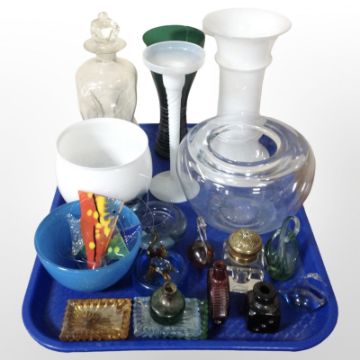 A group of Scandinavian glass wares to include ink bottles, animal ornaments, vases, decanter, etc.