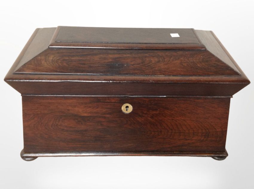 A reproduction rosewood sarcophagus tea caddy in the Regency style, width 35cm.