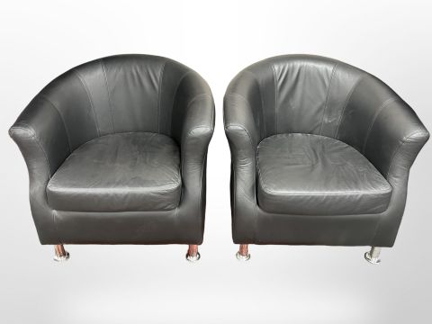 A pair of contemporary black leather tub armchairs, width 80cm.