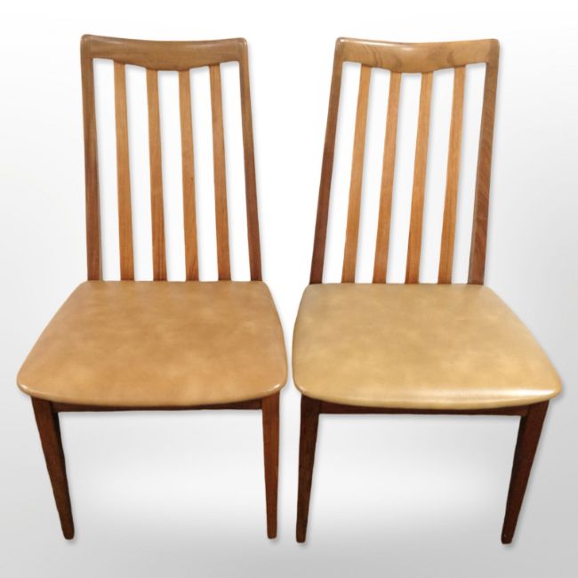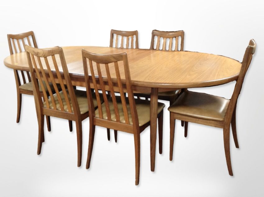 A G Plan teak extending dining table, length 210 cm (extended) x 112 cm x 73 cm high together with a set of six rail back dining chairs with tan vinyl seats