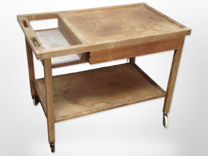 A 20th-century Danish teak two-tier serving trolley on castors, length 81cm.