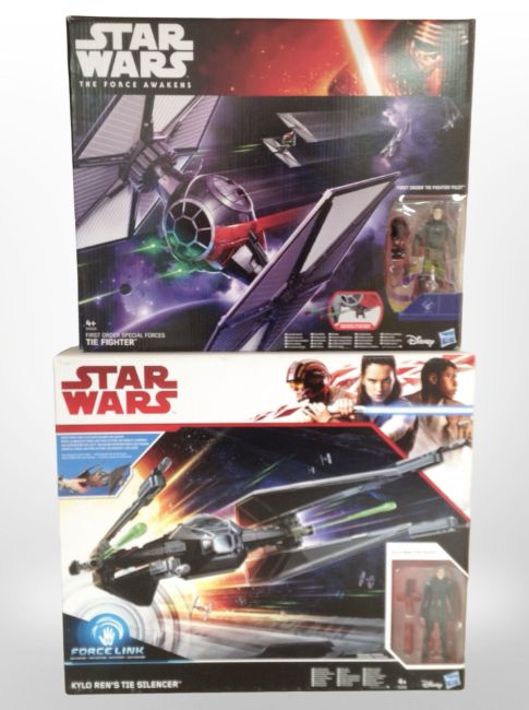 Two Hasbro Disney Star Wars models, Tie Fighter and Kylo Ren's Tie Silencer, boxed.
