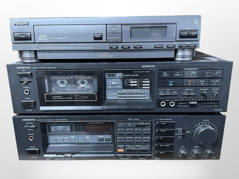 A Philips CD210 compact disk player, Onkyo TA-2027 stereo cassette tape deck, and a further Onkyo TX-27 quartz synthesised tuner amplifier.