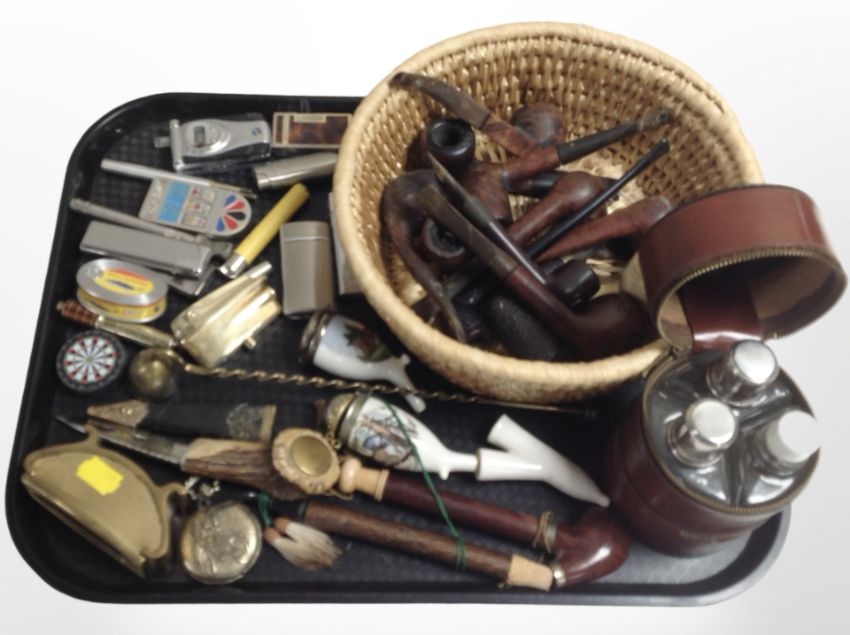 A collection of pipes and lighters, a skean-dhu with polished antler handle by J Nowill and Sons, Sheffield, in leather sheath, contemporary pocket watch, set of three travel flasks in leather carry case, etc.