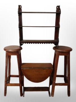 A mahogany wall shelf, width 60cm, together with a small oak drop-leaf table and a pair of stools.
