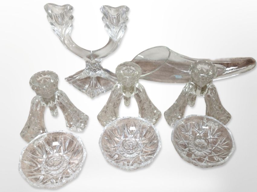A glass cornucopia vessel by Chive, set of three Art Deco tripod glass candlesticks, three further crystal candle holders and candelabrum