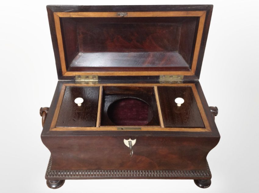 A reproduction mahogany tea caddy in the George III style, width 36cm.