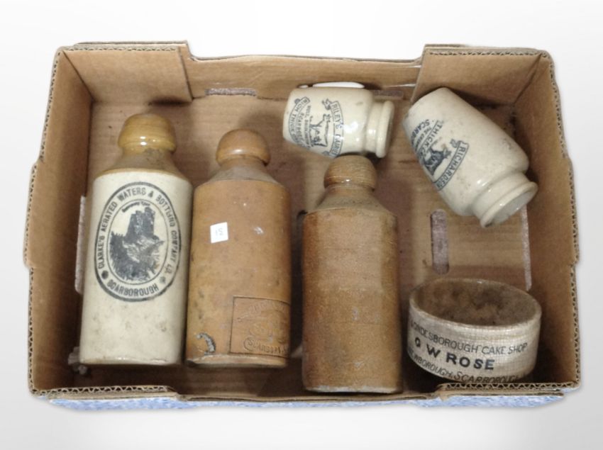 A group of six stone ware bottles and pots, all with Scarborough retailers advertising, tallest 16cm.