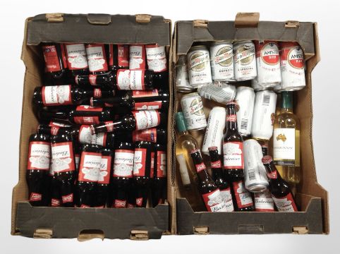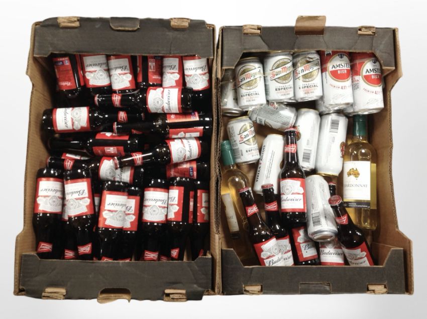A quantity of bottles and cans of alcohol including Budweiser, San Miguel, Chardonnay, etc. (2 boxes)