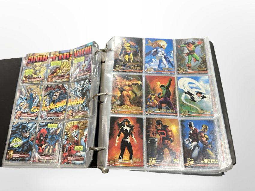 A binder containing a large quantity of collector's cards including DC Superheroes, X-Men, Buffy the Vampire Slayer, Stargate SG-1, Farscape.