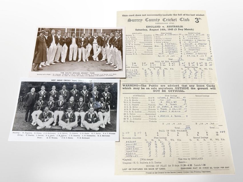 Cricket interest : England / Australia 1948 original Scorecard Edrich, Bradman, Compton, Lindwall, original photographs South Africa touring team 1935, West Indies 1939.