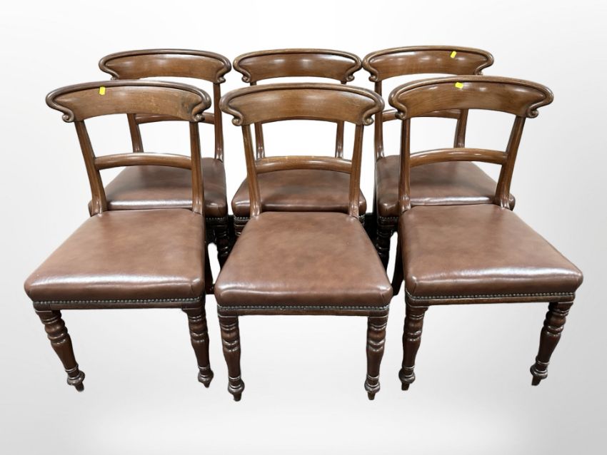 Six Victorian carved mahogany dining chairs with studded brown leather seats