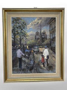 Continental school : Figures in a street, oil on canvas, 39cm x 49cm.