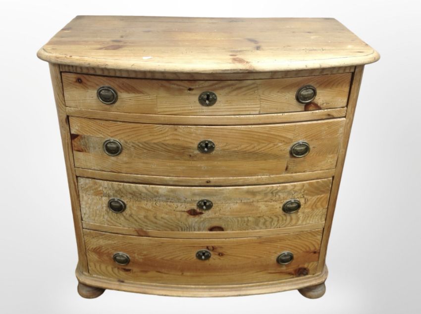 A 19th century Scandinavian pine bow-front four drawer chest on bun feet, 91 cm x 52 cm x 87 cm