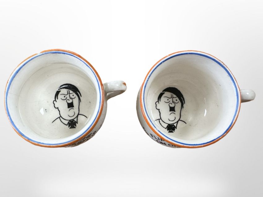 Two novelty Fieldings propaganda pots depicting caricatures of Hitler, 'Flip Your Ashes on Old Nasty, The Violation of Poland', height 3.5cm