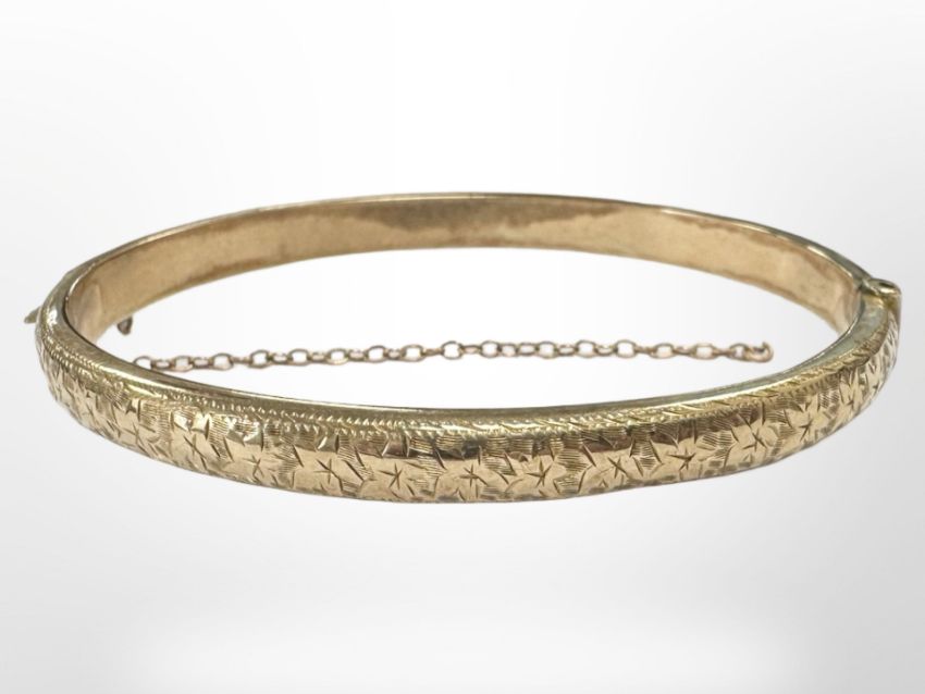 A 9ct yellow gold bangle, 57 mm x 48 mm internally.