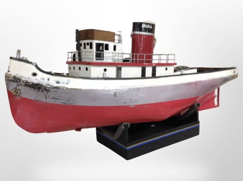 A large scale model remote control boat, on stand, length 141cm.