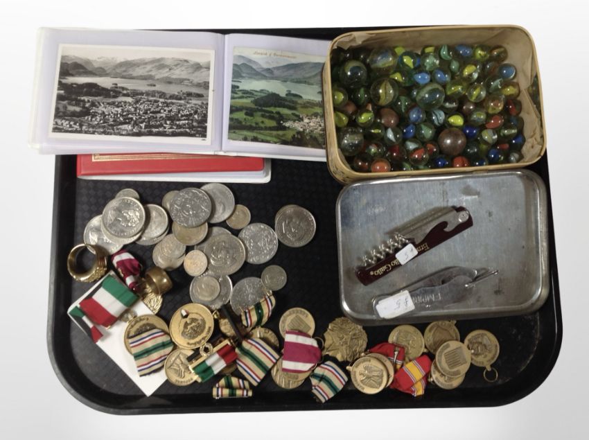 A quantity of vintage glass marbles, crowns, two albums of Lake District postcards, medals, etc.