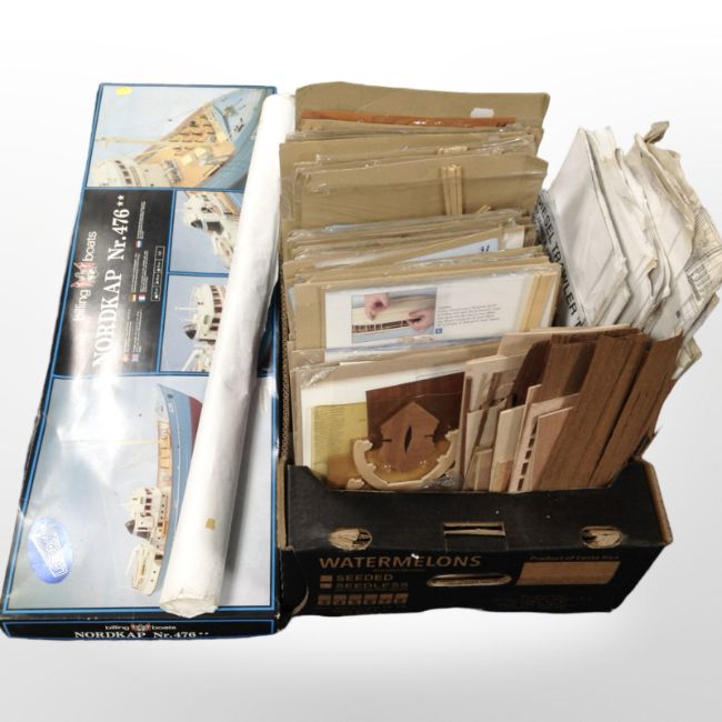 A group of scale model remote control boat building components, some parts boxed, together with a rolled blueprint.