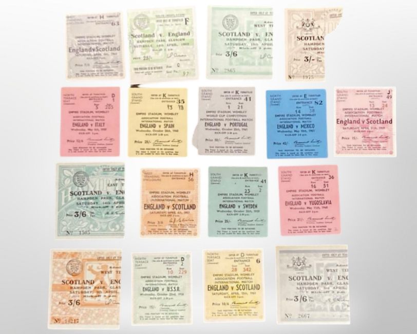 A collection of Football England International tickets England / Scotland, Hampden 1954, 1956, 1960, 1950, 1939, 1962, Wembley 1963, 1957, 1959, 1951, Wembley England / USSR 1958, England /Mexico 1961, England Portugal 1961, England Spain 1960, England / Italy 1959, England Yugoslavia 1960.