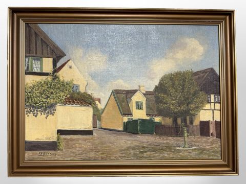Two continental oil paintings on canvas depicting a water pump in a village square and a thatched cottage.
