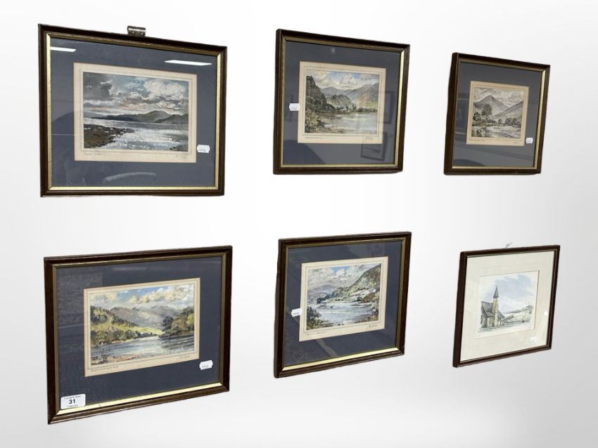 After Geoffrey Lockey : The Fisherman's Lookout, Cullercoats, a limited edition colour print, signed in pencil, 20cm x 15cm, together with five watercolour drawings depicting Derwent Water, Borrowdale, etc.